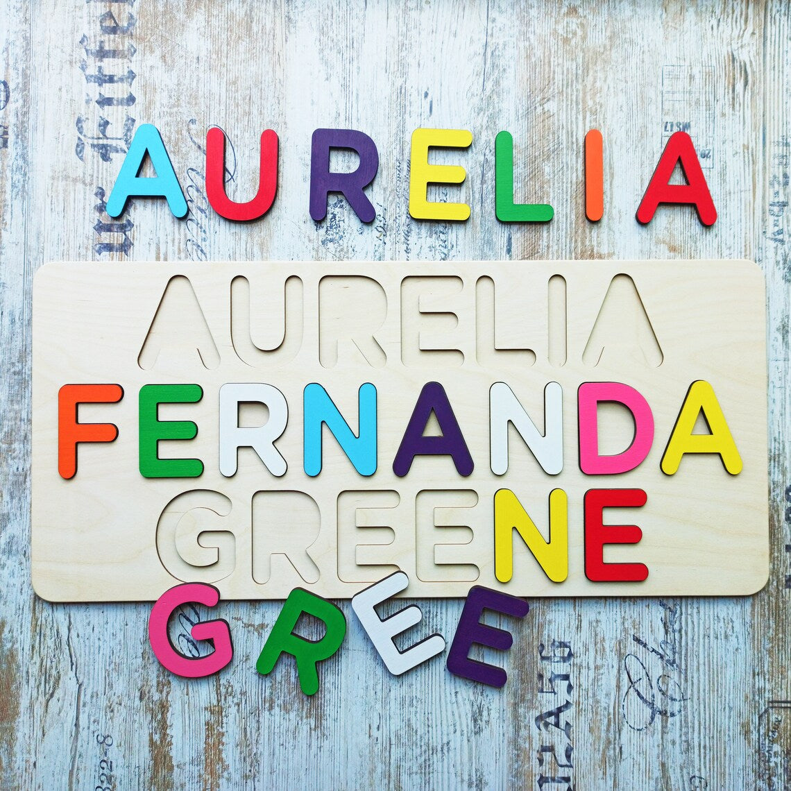 USEFUL LEARNING TOY A personalized name puzzle is a hand-made toy that combines the Montessori technique, helping toddlers learn how to spell their names, learn colors, and develop motor skills.
